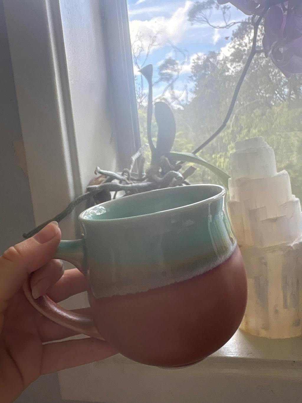 Pink and green mug in hand